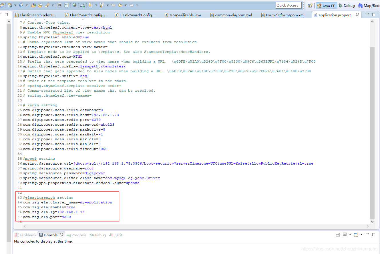 第三步:application.properties 配置涉及elasticsearch 服务器相关配置参数,截图如下: