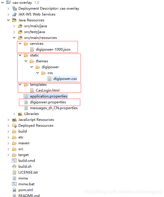 目录结构可以看到,每个子站点,都会新建一个文件夹,文件夹的名称需要和 service里面配置站点的theme的名称对应上,casLoginView.html 这个模板的名称,不能瞎改,这个是固定的